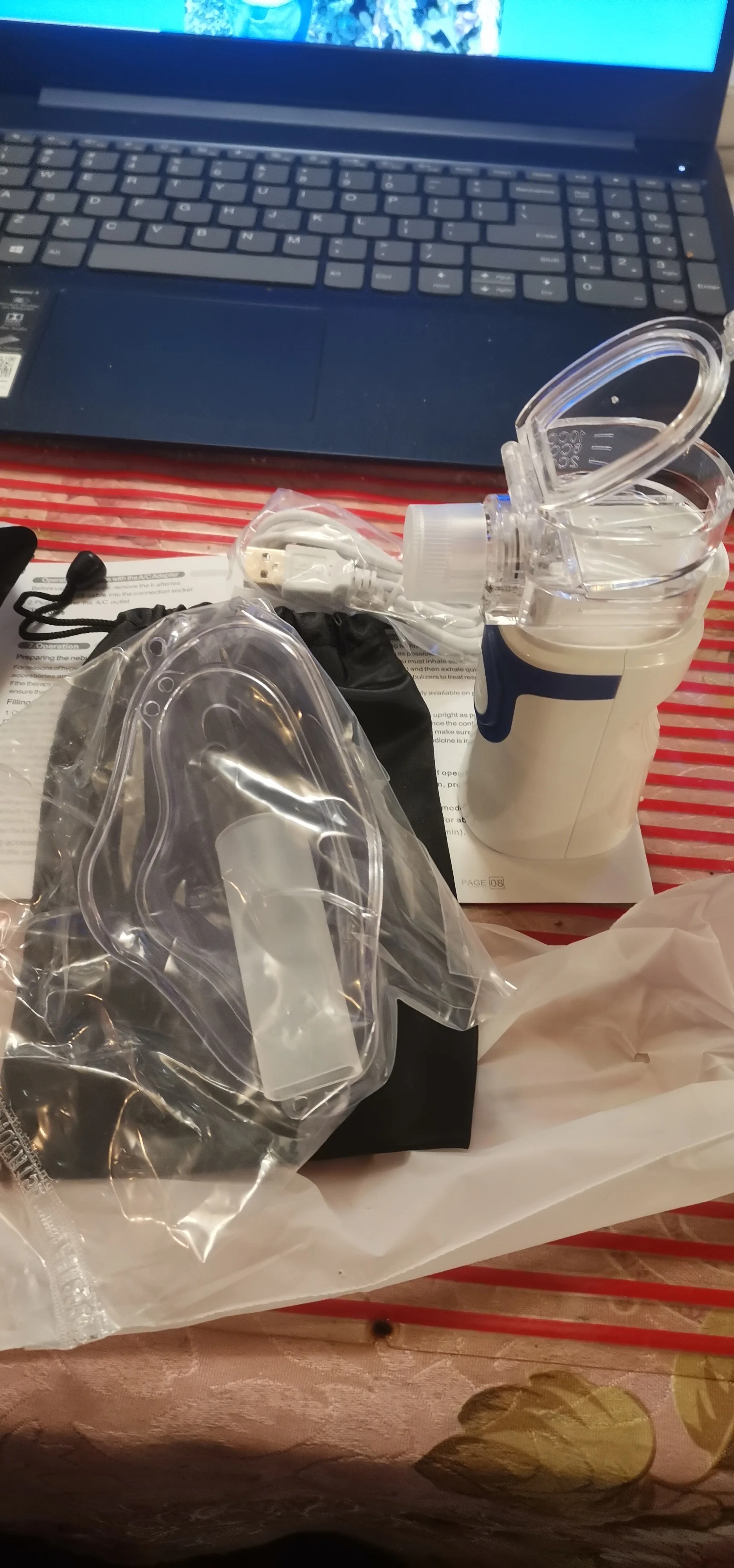 Спасибо огроменное, посылку получила во время, ингалятор работает, в наборе идут маски разного размера, насадка, кабель, инструкция( русского языка не найдете). Парит отлично, проверила водой. Удобный в эксплуатации и мобильный, можно брать с собой, пользоваться при помощи батареек ( в комплект не входят). Купила маме, сезонный бронхит замучил. Всем советую, вещь незаменимая в домашней аптечке! Будьте здоровы! Продавцу отдельное СПАСИБО, вы мне здорово помогли и отгрузили супер – оперативно. Отличных продаж и процветания!